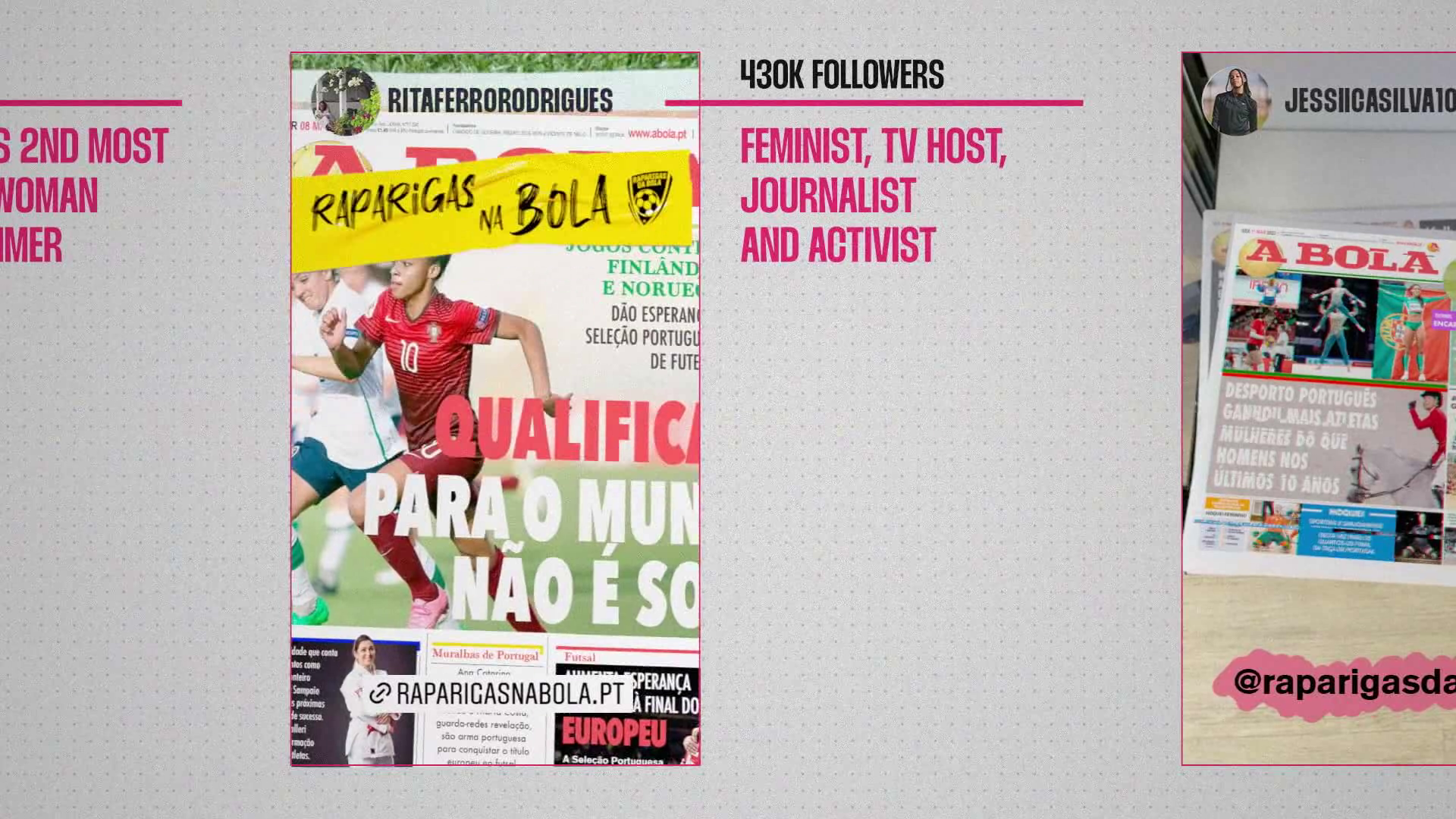 Se no ano passado mostramos a grande diferença de exposição dada pelos principais jornais desportivos, para homens e mulheres, este ano quisemos promover atletas mulheres, contar suas histórias, mostrar suas caras e provar que não faltam boas histórias, dignas de capa. Para isso, tornamos possível que o público transformasse a capa do maior jornal desportivo de Portugal, numa capa só com atletas mulheres, por meio de realidade aumentada. Ao entrar pelo telemóvel no site raparigasnabola.pt, era possível transformar a capa do A Bola em capa de jornais femininos, durante os 5 dias da semana, do Dia Internacional da Mulher. A capa do jornal foi transformada num código visual de realidade aumentada e as notícias foram criadas, todos os dias, junto com duas jornalistas portuguesas.